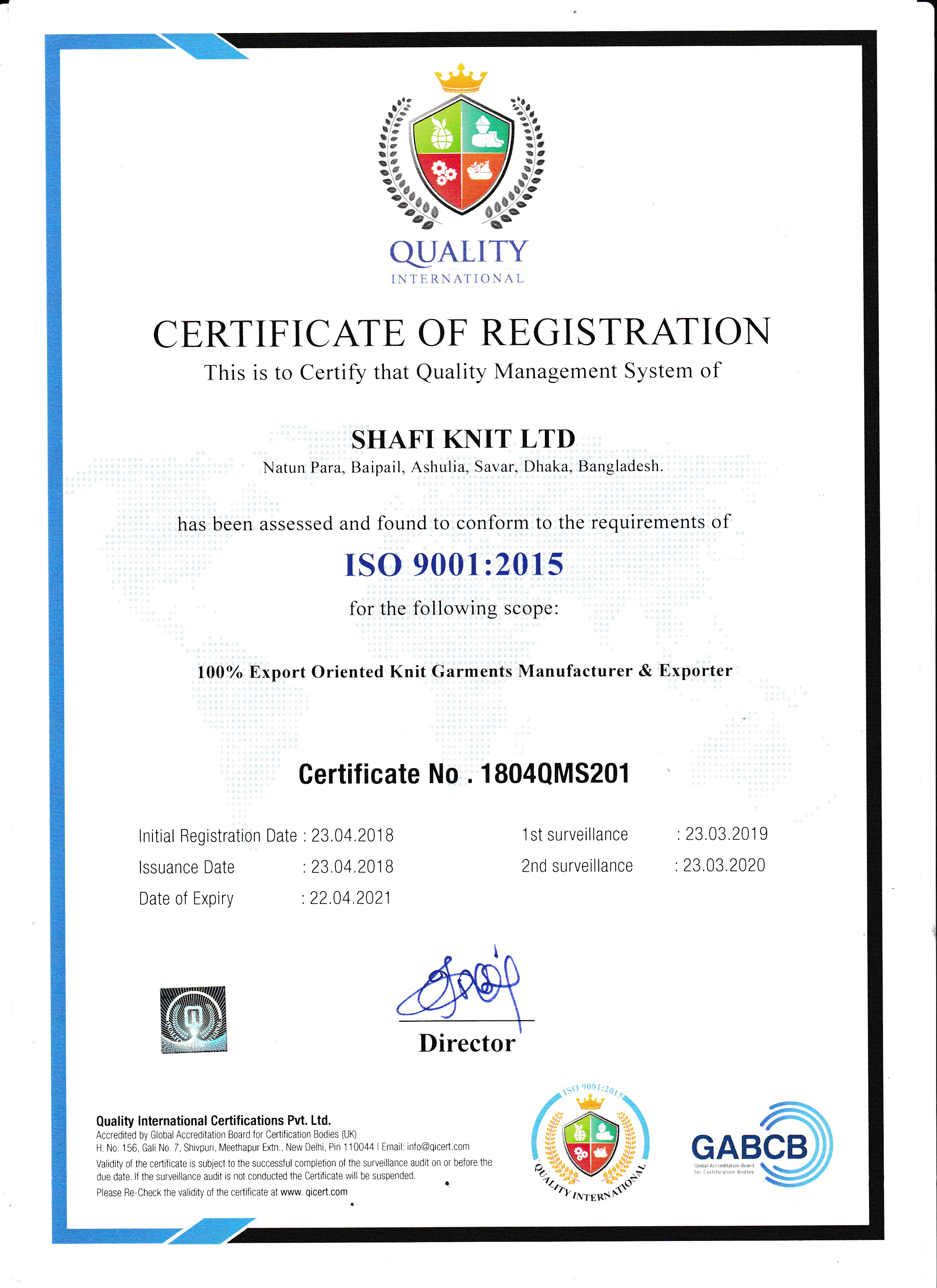 Shafi Knit, Natun Para, Baipail (Beside DEPZ-2) Ashulia, Savar, Dhaka, Bangladesh a 100% export oriented organization registered in the Board of investment against registration no. L-62050310070-H dt. 00.00.2009, which is duly, changed its status Shafi Knit on 00/00/2009